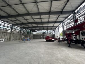 現在、鉄骨建て方は完了し、工場棟の外装工事、管理棟の内外装工事、外構工事を平行して進めております。